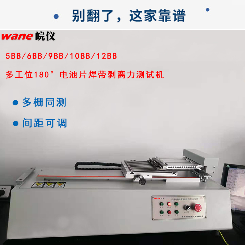 12BB電池片焊帶剝離強度試驗機兼容3BB/5BB/6BB/9BB/10BB/12BB電池片多工位多通道,兼容156mm/158.75mm/166mm/210mm/230mm等不同尺寸電池片,MBB電池片專用測試夾具可根據(jù)不同柵線間距,夾具可調(diào),操作簡便,省時、省力。多柵同時測試,夾具端移動,傳感器測試過程中靜止不動,更好的保證測試精度。